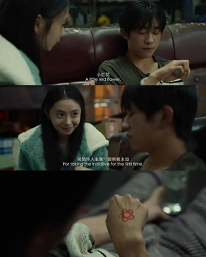 孩童时期,很多人会期待得到老师或家长的“小红花”,它的能指是小红花图案,从属性上看,“花”本身就具有一种美好的意义,大家关于它最普遍的理解是“奖励”“鼓励”,这就是“小红花”的所指。“小红花”贯穿始末,出现在电影片名、主题曲以及电影台词里。患癌少年韦一航在医院复查,难过之际,对面生病的小女孩在窗户上画出一朵“小红花”并向他招手;韦一航醉酒后鼓起勇气雨中告白,马小远在他手背上画出一朵“小红花”;马小远生病住院期间,韦一航在她手背上画出相同的“小红花”;影片结尾,一大片羊群每一只身上都带着“小红花”。导演将“小红花”进行编码,观者可以从中解码出不同的象征意义,如:陌生人对你招手微笑的温暖,朋友对你生活积极主动的奖励,两人走散后重聚的约定。社会心理学家米德的符号互动论指出,人与人之间的交流互动是以“符号”为媒介的间接沟通。交流的双方不是对对方的符号或者信息传递作出简单的回应,而是一种积极能动的回应,人们会赋予这些“符号”不同的意义。“小红花”作为符号的一种,具有表达的复合型和解读的开放性,它可以像《夺冠》中的“女排精神”,释放出一种积极、向上的信号,也可以像《哪吒之魔童降世》中哪吒“我命由我不由天”的怒吼,迸发出一股坚韧、顽强的力量。导演韩延表示:“‘小红花’可以成为人与人之间相处的润滑剂,让大家达成某种理解。‘送你一朵小红花’,相信身边永远有人默默爱着你。”因此,在不同的人看来,“小红花”不只是一朵花,也许是奖励、是爱、是希望、是支撑人坚强的力量。