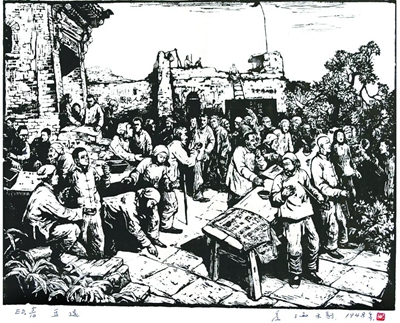 “选举的时候,大河村的农民非常认真,他们很注重选出代表他们利益的村长,这出乎我父亲意料。有的老人投豆子时怕投错了人,还专门转到这个人前面,看准了之后才投下这个豆子,他们还是真正想选出自己的代表人。所以父亲在这幅画里,不仅刻出了选举的场面,还在背景加了一条标语‘中国共产党万岁’。”彦东说。