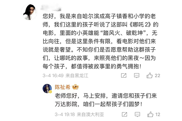 3月8日观影之后,孩子们纷纷开心地表示“要和哪吒、敖丙做朋友”。留言“许愿”的老师显得更加开心,她说:“没想到能得到万达电影董事长的回复,更没想到能这么快帮孩子们实现愿望,相信孩子们感受到社会充满爱,也会用自己的爱去回报社会,同时也能更勇敢地去面对未来。”