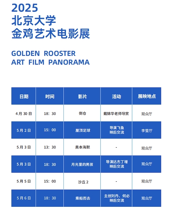 影展将于4月30日至5月6日在北京大学百周年纪念讲堂举行,除影片展映外,还将举办专家导赏、电影主创映后交流等活动,通过在高校展映部分金鸡奖中小成本获奖影片和最佳外语片、金鸡国产新片展展映影片,宣传中国电影金鸡奖品牌文化,提升金鸡奖影片的传播力、影响力,增强电影文化交流与合作。电影走进高校,助力推动校园人文精神建设,提升大学生人文素养。
