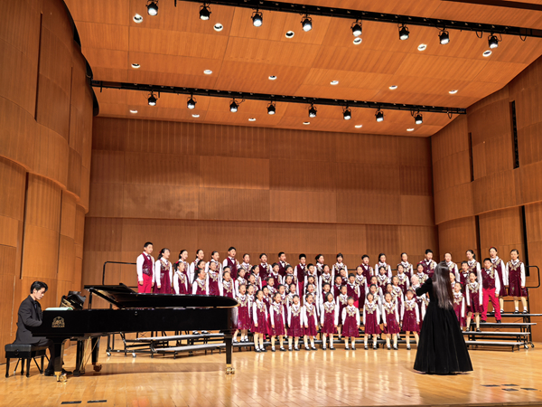 幸福校区“梦之声”合唱团、“金色之光”合唱团率先登场,以一首《as long as I have music》开启音乐之旅,清澈歌声瞬间点燃现场氛围。随后,“梦之声”合唱团接连带来《梨花又开放》《音有爱》《sing sing sing》,或唤起对故乡的绵长思念,或传递温暖治愈的情感,或用轻快节奏带动全场氛围;“金色之光”合唱团则演绎《天空不能保守秘密》《梦的地图》,以轻缓旋律诉说青春悸动,以童声勾勒追梦图景。幸福校区一年级“金色之光”合唱团新团员们,还与老团员携手带来充满童趣的《kusimama》,稚嫩又热情的歌声,尽显童真活力。