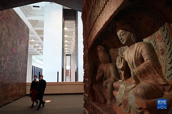 参观者在中国国家博物馆的“盛世修典——‘中国历代绘画大系’成果展”上观看等比例高保真数字化3D打印复制的云冈石窟第6窟南壁“文殊问疾”屋形龛(2022年9月29日摄)。新华社记者 金良快 摄