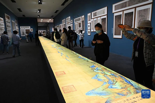 参观者在中国国家博物馆的“盛世修典——‘中国历代绘画大系’成果展”上观看放大两倍的《千里江山图》灯光特效图(2022年9月29日摄)。新华社记者 金良快 摄
