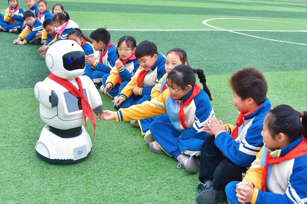 △2025年3月10日,江苏南通,如皋经济技术开发区实验小学课间,学生与智能机器人“宾果”互动。