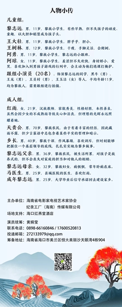 6、跟组小演员(20名):饰演黎志远的同学,黑牛(男)、王龙(男),王员村(男),王玉洁(女)等人,班上学生平均年龄在11岁,均为黎族人,需要跟组进行拍摄。