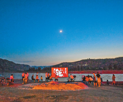 近日,三交镇黄河边,村民在观看露天电影《铁道游击队》。刘亮亮摄(人民视觉)