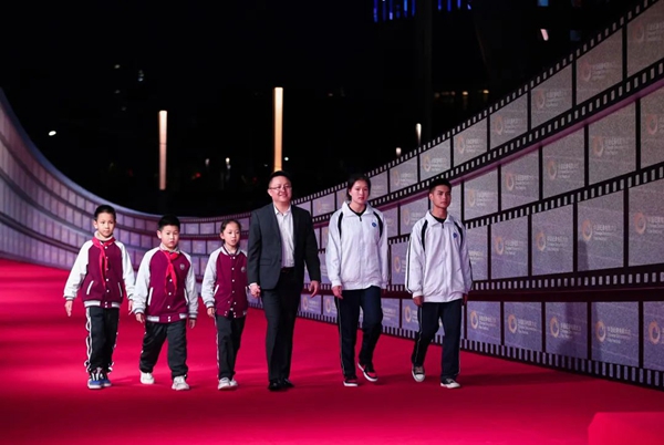 《棒!少年》主人公、公益棒球队“强棒天使”创始人兼教练孙岭峰和棒球少年们等红毯亮相