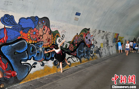 8月20日,络绎不绝的游客在厦门大学的芙蓉隧道内与涂鸦作品拍照留念。吕明 摄
