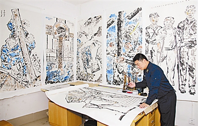 经过一年的筹划,他用4个多月的时间完成了5幅一组的画作。当作品展现在官兵面前时,浓墨重彩的中国画风,贴近官兵生活工作的场景,一下吸引了官兵驻足。
