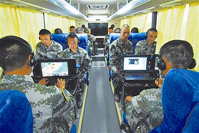一辆涂满迷彩色的“大巴”停在演训场,车载空调吹出阵阵凉风,给人带来清新凉爽的感觉,32名官兵端坐在电脑前上网冲浪。某旅政委曹耀生说,这台多功能网络车,网络服务器、笔记本电脑和电视会议系统相联,还具备政工网浏览、电视远程会议、移动指挥作业、备课示教、娱乐休闲等5种功能,部队执行任务到哪里,网络车就保障到哪里。