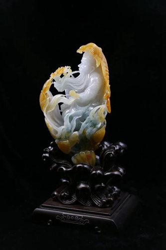 作品风格庄重大气、神形兼备、通灵飘逸、巧用俏色,彰显了北派宫廷玉雕的艺术风格,也展现了精湛的雕刻技艺和博大精深的中国玉文化底蕴。