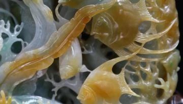 翡翠玉雕作品《定海神针》,原料是一块外皮呈棕黄色的水石料,瓤是糯冰、黄白相间,肉质细腻,冰裂纹也不少。经过崔奇铭的设计雕琢,它变成了美丽的海底世界——缠着银龙的碧色料,是耸立的“定海神针”,黄皮俏色料,则巧雕成海中各种生物。