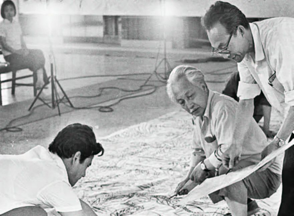 1979 年夏,张仃(中)、张一民(左)、楚启恩(右)在首都国际机场壁画《哪吒闹海》绘制现场