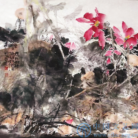 正因为彻黑与浓红的交织对立,路民的荷花意境奇崛险峻,这又是在审美品格上区别上面提过的众多画家的特征之一。画荷,很多画家追求的还是美而柔,也就是细声慢语,犹如小夜曲和轻音乐。但路民的荷花却是管弦乐,甚至是交响乐。他以苍劲去破细腻,以陡峭去对抗和气,这就对人习惯的思维和视觉有了冲击力,有了意料之外的效果和意境。这也就应和了传统中国画提倡的“险”。造险是创意,破险就是功力。他能破能立,他的荷花就同时具有了硬朗与柔媚两种品质。这恰如侠骨与柔肠,既脱俗又不厌世,既有坚定的信念又抛媚眼、目含秋波。所以看他的荷花,犹如赴一场大美而心惊肉跳的约会。