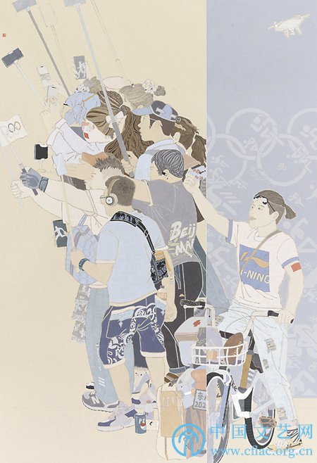 作品中高正所绘反映参与奥运的喜悦、为赛事呐喊的中国画作品《全民盛事》,吸引了笔者。《全民盛事》这幅作品的巧妙之处在于美术家虽然重点聚焦了马拉松比赛,但画作展现的却不是赛场上激烈拼搏的运动员,而是赛场外的观众和老百姓,通过他们争相拍照、呐喊等肢体语言和丰富表情,表达了全国人民迎奥运、庆盛事的热情和主旨。刘玉龙创作的油画作品《中国梦——丝路梦之连云港》,将绘画的视野投放到新丝绸之路的新起点——连云港,用海边港湾中毗邻交错的大小船只,构筑起实现新时代中国梦的时代节奏。方向军的中国画作品《园林组画》,采用九宫格的图式,撷取了江南园林不同的九个小景,用风格化的形式表达了对传统造园艺术的敬仰。李果的花鸟画作品《生命如歌》,描绘了芦苇丛中百鸟欢腾的趣味场面。从各种鸟的绘制中,仿佛让我们看到五代时期黄筌《写生珍禽图》有了现代图式的积极响应。还有诸如赵炳宇创作的《晒夏》和赵鹏创作的《低碳时代》等一批优秀作品,通过艺术家独特的关注点,将视角瞄准到小人物的平凡事情,见微知著,用娴熟的技巧热情讴歌人间的温情、赞美人民群众的幸福生活。