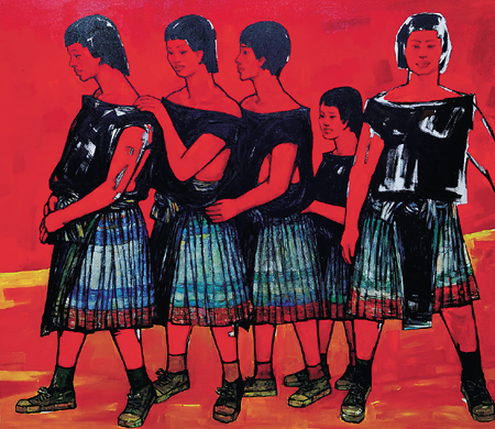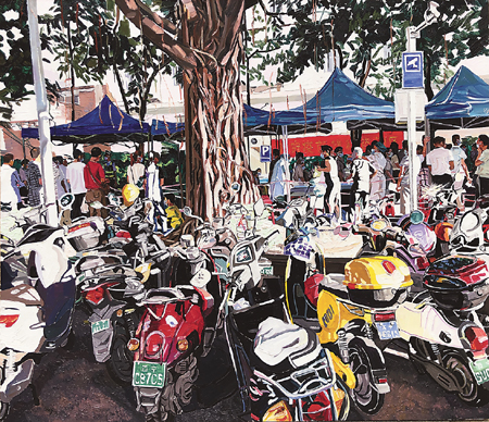谢麟的《悠远的岁月·鼓楼》是写生所得,更是“写”心中印象,《圣地·白裤瑶歌圩》则是他参加了白裤瑶传统民俗节庆歌圩后所抒发的更为主观的感受;韩克伟的《前沿》系列用类似工笔画的手法,细细描摹了医院抗击疫情的场面;潘新权的《西大公共课前的自行车》,画面里的自行车,都是“写”出来的……诸多作品,都强调绘画的平面化与装饰意趣,减弱了空间的深度,以油画语言表现写意性的同时,又与中国画的写意构成联系。在“北回归线油画群体”的创作中,乡土、都市、工业、风景、抗疫诸多题材,都呈现出与传统现实主义油画不一样的图式和表达语汇。在画面之上,现实主义的表现更为多样性,生活于是并非“再现”,而更需要“表现”。