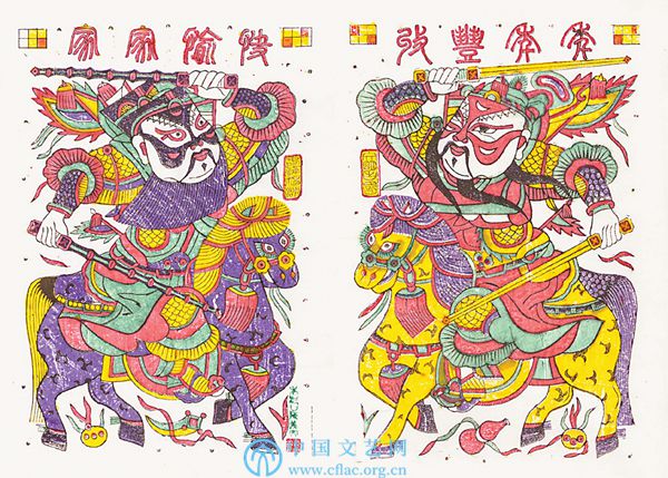 中国门神画先以虎作为题材,画于天子门上,到汉代才出现起源于古代神话故事的神荼、郁垒二人作门神的习俗。宋代,随着手工业空前发展,出现了木版雕刻刷印的纸质门神画,除传统的神荼、郁垒二人及武士,还出现了文臣朝官形象,形成了大门贴武士、院内厅堂两侧贴文官的风俗。自宋之后,门神的神性功能逐步淡化,门神形象多由通俗小说中的英雄人物担任。