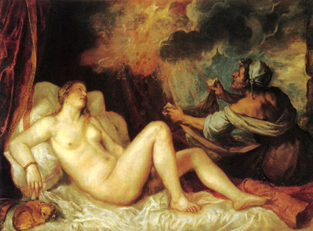 《达那厄》取材于希腊神话:阿尔戈斯王阿克里西俄斯占卜预示,说他必死在外孙的手中,这使他很恐惧。为了逃避不幸,阿尔戈斯王专门造了一座铜塔,把未出嫁的女儿达那厄关在塔内与世隔绝,指派一位老妇人监护她。天神宙斯透过塔窗发现美丽的达那厄,一见倾心,常化为一道金光来与达那厄相会,为了支走看管她的老妇人,在老妇人的面前变成一阵黄金雨。不久达那厄怀孕生了一位神话中的英雄珀尔修斯。最后老国王仍然没有逃脱死于外孙手下的厄运。画面的构图没有超越入睡维纳斯的基本动态,只是画中女神的动作更加开放,期待的神情更加专注,前景环境更具性感,画家有意将主体人物置于强烈的光照下,那强光正是天神宙斯的化身,从女神的姿态神情看,她此刻正在享受情爱的温存,进入身心极乐境界,她 所珍惜的是美好的爱情,无视撒落的金币。画面的背景又是另外一番景色。天空乌云密布,似有雷电交加之势,在黑暗中却又透出一片金光,随之而落的是一阵黄金雨,奇丑可憎的老妇人立即理起围裙,等待金币的降落,那专注贪婪的姿态和神情令人生厌。画家塑造了两个人物,表达了两种不同的思想感情和人生理想追求。达那厄身处前景光明处,沐浴在爱的金光中,这代表着纯洁、崇高、美好的人生理想;而与爱情无缘的老妇人,则在黑暗中追求金钱。在这种强烈的光明与黑暗、爱情 与金钱的对比中,我们可以窥见到画家的内心世界。