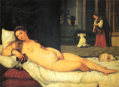 如果说乔尔乔内的《入睡的维纳斯》描绘的是亦神亦人的艺术形象的话,那么在28年后,提香60岁时画的《乌尔比诺的维纳斯》,则完全是世俗环境中的女子。这幅和《入睡的维纳斯》可谓姊妹之作。提香对画中人的动态、神情以及环境的改变,体现了时代的变化。乔尔乔内笔下的维纳斯在沉睡,而提香的女神则已醒来,深情地看着这个现实世界,右手从后脑挪开,打破了禁锢身体的椭圆形密封的包围线,呈开放状,已从大自然来到现实的豪华卧室。整个画面给人的第一感觉是一位贵夫人出浴后躺在华贵的卧榻上,期待着情人的到来。人物的动态、神情和环境已无一点神性,完全是世俗女子的写照,更具感官的魅力。有人说画中裸女是一位叫埃列奥诺拉·乌尔比诺夫人的肖像,画家是受乌尔比诺公爵委托创作的,提香所描绘的裸女较乔尔乔内更加具有人性,是充满生命的血肉之躯,体态更加丰腴完美,容貌端庄大方,既富青春魅力,又健康成熟,体现了文艺复兴开放人性的本质精神,用具体真实的艺术形象反对封建的禁欲主义。