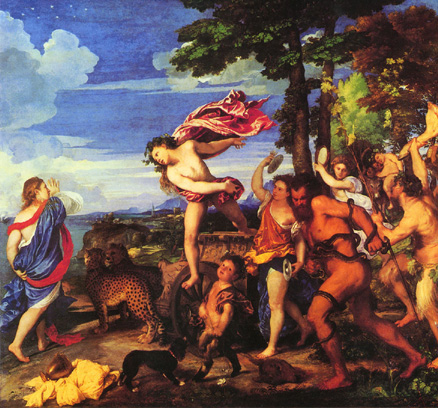 酒神巴库斯,希腊名叫狄俄尼索斯。巴库斯的好友因决斗而死,他含泪将他埋葬,不久在墓上长出葡萄,他将葡萄的汁榨在牛角杯里饮下,顿觉兴奋异常,这就是葡萄酒。后来他把这甘醇的美酒奉献给奥林匹斯诸神,同时希腊人民也得到了他的恩赐。所以在每年秋季葡萄收获时节,希腊人都要举行酒神祭,成为希腊的重要节日。这幅画又名《安德罗斯岛居民欢庆酒神节》。画中所描绘的情节,是在爱琴海基克拉迪斯群岛中的一个叫安德罗斯的小岛上,居民们正在纵情狂欢,饮酒作乐,谈情说爱和跳舞,以庆祝酒神的节日。画家借诸神饮酒的狂欢场面,表达人类的激情。画中人物形象大胆而放荡,色彩丰富多变,气氛热烈,群情激昂。这是对人性的赞扬和对神学的宣战。在画幅压角处,仰卧着一位全身袒裸的美丽女子,这是适应画面的构图需要。这“斜倚的女人体”姿势是继承和发展乔尔乔内的样式,也为后来的历代画家树立了这种姿势的典范。
