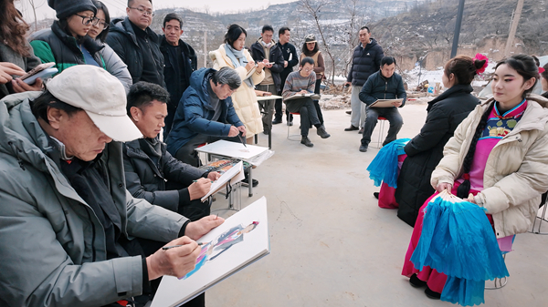 艺术家们让色彩在纸面上流淌、交织,像诗歌在麦地里牧羊,画面中很快就铺满了通红与金黄,那是苹果的红,那是谷子的黄,那是大地最真实的色彩,也是农民们心中最美的风景。艺术所达,灵魂所居,他们以平视的眼光用心凝视这片土地和土地上的人民。山西省美协水彩画艺委会副主任栗强连续两年参加活动,他说:“不管是春节热烈的秧歌还是丰收节的锣鼓喧天,都让人深切感受到陕北人民对生活的热爱,这都是我一次又一次跟随周刚前来的理由。”