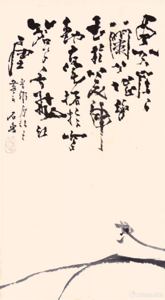 同样,石鲁画过一张画,画面只有三个兰花瓣,后面是像火柴一样被烧焦的一个焦墨花蒂,他画这个的时候,只写个名字石鲁,连印章也没盖,这是给郑乃光老师的一幅小作品。当时,我刚从东北调回来,去郑乃光老师家里,问他,听说石鲁疯了。他说,“你看看这个,石鲁他疯了没有?”我一看这张画,心里就一下子明白:“石鲁没疯,他绝对清醒,他是自我标榜——我这么清白的人,被人把花头掐掉随意扔地下,正好扔在正中间……”石鲁那种自白,才叫艺术家。他同样学习八大构图,但却用得极为高妙。八大画小鸡,我这是兰花,就解决问题了。啥叫聪明,就是石鲁看过八大《小鸡图》,知道其中的高度。他绝对不会人家画个小鸡放中间,我就画一个麻雀放在中间,这只是徒有其表的复制和模仿。