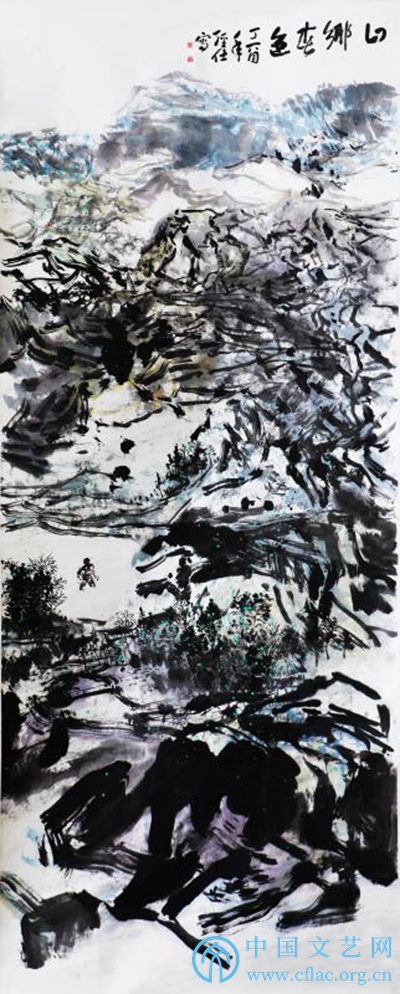 其山水,丈二巨幅上,笔走龙蛇体现细腻情感;深沉而苍茫的山脊上,隐约可见的老黄牛正走向袅袅炊烟……
