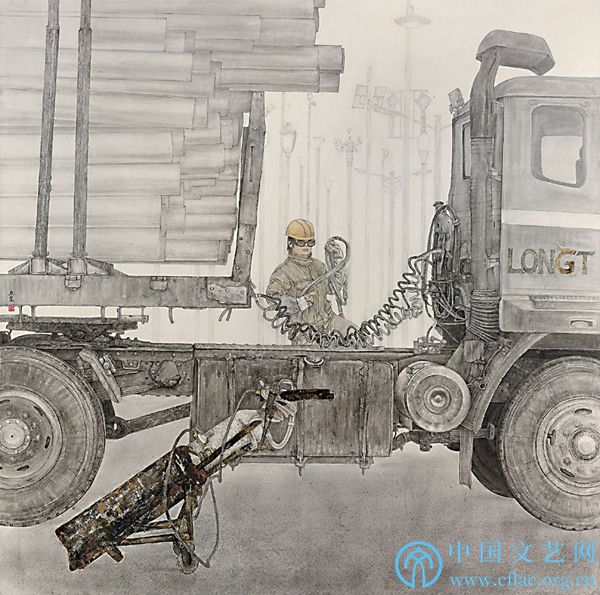 我创作了一幅作品《路灯的森林》,选取一位在休息之余依然不忘整理琐碎杂物的女电焊工形象,将其置身于一辆体积硕大、装满银色灯杆的货车旁边,形成鲜明对比。货车的质感处理方面,我借鉴山石树木的画法,一笔一笔耐心地皴擦点染,没有做任何肌理效果。层层积墨法将货车斑驳生锈的水箱、铁皮、螺丝钉、跋山涉水行驶万里的轮胎刻画入微,结合橡皮和砂纸打磨,达到我预想的效果。整辆货车统一在灰色调中,银色的灯杆处理成浅灰色,地面是深灰色,为了表现粗糙的工厂地面,我采用“喷壶吹”的技法将地面区吹出层次,力图表现电焊工人真实的工作场景。工人的工作服亦没有刻意描绘,简单勾出线条,用冷黄罩染,同时将头顶的安全帽处理成暖黄色,在视觉上达到平衡,也打破沉闷的单一色调。工人身后是渐渐远去的路灯模型,这是当下美丽城市的缩影。画面最前端是一辆装有电焊氧气瓶的手推车,呈45度倾斜,为了表现电焊氧气瓶的斑驳表面,我采用“烫金铂”的技术处理,这是我第一次尝试这一技术,最终经过反复试验,达到了预期目标。观看整张画面,灰色调的艺术处理将电焊工的工作场景真实表现,而女电焊工专注安静的神情使画面得到统一和升华。这幅作品,寄托着我对劳动人民的一份尊重和敬佩。