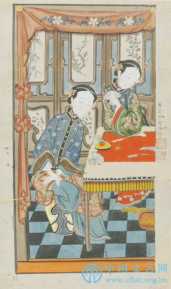 叶戏仕女图 清雍正 杨柳青年画 中国美术馆藏