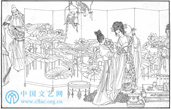 高云的画,大多透着回归本真的清新与淡雅,但在遇到诸如《长生殿》《张骞》等命题创作时又有所不同。指定了范围、题材的命题创作如同“带着镣铐跳舞”般有诸多限制,必须在研究和遵循史实之上,尽可能真实地还原当时的情景和意境。在创作连环画《长生殿》时,他选择以盛大和繁荣的气象为基调。长篇连环画不同于可以抽象描写的小说,必须做到明白具体、处处画到。唐朝的皇室建筑是什么样?男女老少的服装如何?摆设细节又是如何?基于此种严谨考究的治学态度,高云用了一年半的时间精雕细琢《长生殿》,为了让作品画面更符合大唐史实,高云“闻唐而动”,“满世界”去追踪大唐遗存的相关内容:作品中大到建筑场景设置,小到车马、器皿、服饰、家具、发饰等,都是高云四处奔波采集、终日在博物馆中细细考证,并参考了大量文献资料,几乎做到了件件有出处,如懿德太子墓壁画中的亭台楼阁、永泰公主墓壁画中的宫女图、陕西历史博物馆藏的彩绘釉陶戴笠帽骑马女佣的骑手形象等等。至今许多电影、电视剧、图书的美工也还在参照《长生殿》进行再创作。