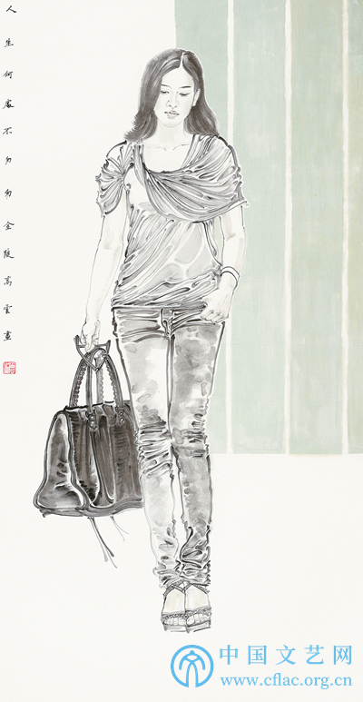 目前在中国美术馆举办的“天高云淡”作品展展出了高云自1979年至2019年40年之间不同时期具有代表性的151幅重要作品。这也是高云首次在中国美术馆办个展。展览的6个板块“如意令”“花非花”“酹江月”“镜中人”“忆江南”“锦上花”均以宋词词牌冠名,从连环画到邮票、从精致的工笔女性到兼工带写的文人高士、山水丘壑,再到写意的都市行者、新疆写生,涉猎的体裁和题材十分丰富。如连环画作品《灯花》《罗伦赶考》《长生殿》,邮票作品《纪念徐霞客诞生四百周年》《张骞》《宋词》,国画作品《永乐修典》《还记得我们吗?》《都市行者》《我·我们》等。极具表现力与塑造力的线条是高云的标志,在他看来,线“很神秘”,也“很丰富”,中国的线讲究书法笔法,承载着感情与修养甚至画家个性、情绪的表达,是中国绘画中最重要的部分。从李公麟、吴道子的线到任伯年、陈洪绶的线,高云将线作为主要学习对象之一和继承的切入口。他以顿挫波折、灵动自如的线条勾勒出女性“了无一点凡尘”的静雅纯洁,高士“幽坐弹玉琴”的坦然旷达,穿梭于城市之中“都市行者”们的千姿百态,以及法国画家安格尔笔下古典华丽的西方面庞。他画古,也画今;画中国人,也画外国人;画帝王宫中传唱千古的爱情故事,也画平淡无人知的百姓生活。