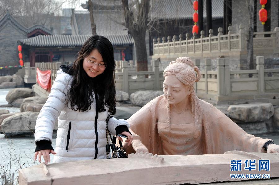 2月23日,在榆次老城新春蜡像展上,一名游客在模仿“蜡人”的弹琴动作。元宵节来临之际,位于山西晋中晋商故里的榆次老城举办了一场古典艺术与现代工艺相结合的蜡像展览,近百件作品把放爆竹、贴春联、扭秧歌等民俗活动通过蜡像展现出来,神形兼备,栩栩如生,吸引了大量游客前来观赏。(新华社记者 王飞航 摄
