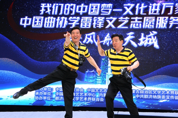 正值全国文艺界学习贯彻习近平总书记在文化传承发展座谈会上的重要讲话精神和中宣部召开文化强国建设高峰论坛之际6月13日至15日,由中国曲艺家协会、中国文艺志愿者协会、内蒙古自治区文学艺术界联合会共同主办,中国文联曲艺艺术中心、内蒙古曲艺家协会、中共额济纳旗委宣传部承办,额济纳旗文学艺术界联合会协办的奋进新征程  建功新时代——“我们的中国梦  文化进万家”中国曲协学雷锋文艺志愿服务走进东风航天城,为奋战在大漠深处的航天工作者送去精彩的文艺演出,以文艺的方式致敬航天英雄。