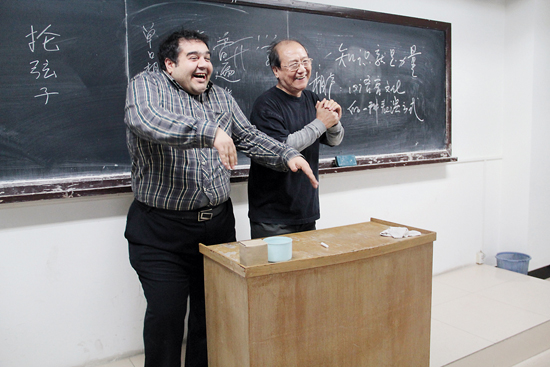 大家都以为丁广泉的学生必定个个都是中国通,是待在中国的“洋人精”。实际上,丁广泉的相声课堂里也还是会坐着一些中文成绩并不十分优异的留学生。“如果仅仅重视这些学生的说学逗唱,那确实有一些学生的水平不够。因为,相声是一门博大精深的表演艺术,很多中国人尚难掌握,何况是外国人,有的学生不具备说相声的条件,也不具备表演的天赋,但从我个人来讲,秉承孔子‘有教无类’的精神,只要他们真正热爱中国文化,我就愿意不遗余力地教他们。”