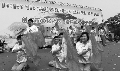 为减少社区文化活动的同质化,走出长期在低水平徘徊的局面,铜陵市推出了“三个工程”。一是为提升业余团体素质的“样板工程”,即积极培育有较高艺术水准的业余文艺团队,已选定15个样板文艺团体,其中大多是长期在社区基层活动,在市民中享有声誉的团队。二是社区文化“品牌工程”。市级有两年一度的社区文化月、百场文艺进社区、市文化艺术节、中国(铜陵)青铜文化博览会、中国(安徽)民俗文化节、“铜都讲坛”进社区等,区或社区办的有邻里节、风筝节、美食文化节等等,都很具人气。其中,社区文化月上百项大小活动,直接参与的市民有10多万。阳光社区的王先生说,讲坛搬到社区,讲的又贴近百姓生活,我们觉得既方便又实用。三是社区文化建设“示范点”工程,即以创新思维推进文化社区的建设,要求各个社区因地制宜,根据各自的文化资源人才条件和区域特点,培育出文化亮点,彰显自身特色。这是更高层次的社区文化建设。铜陵市目前选取10个大社区推进“示范点”工程,如鹞山社区的民间艺术、安铜办社区的黄梅戏演唱等,但要打造真正具有特色的文化社区实属不易,这项工程还须下更大的苦功才能真正见效。