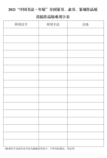 (3)为便于准确登记,及时联系投稿作者,请认真填写《2021“中国书法·年展”全国篆书、隶书、篆刻作品展投稿登记表》《2021“中国书法·年展”全国篆书、隶书、篆刻作品展投稿作品疑难用字表》(启事后附表格,可复印使用,也可从中国书法家协会网站http://www.ccagov.com.cn、中国书法出版传媒网站http://www.zgsfcbcm.com、《中国书法报》网站http://www.zgsfbs.cn、中国书法出版传媒微信平台、书法出版社微信平台、《中国书法报》微信平台、《中国书法》杂志微信平台下载),连同身份证复印件、退稿费汇款单复印件、书写内容使用的版本复印件,随作品一并寄出。