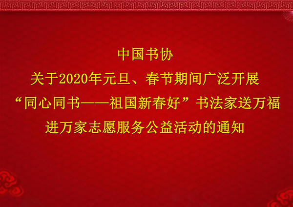 中国书协关于2020年元旦、春节期间广泛开展“同心同书——祖国新春好”书法家送万福进万家志愿服务公益活动的通知