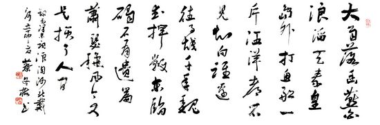 此幅作品书写的是毛主席诗词,《浪淘沙·北戴河》,“大雨落幽燕……”,此作品恬淡、静气、幽雅,但又透出几分雄壮和威武。既像平静的海面下激流涌动,又像千军万马决战前的宁静,等待着冲锋号角,跃马扬鞭,勇往直前。作品不牵不挂不连,不张不扬,细观其笔意顾盼呼应,引带提按,起承转合,超凡脱俗,浑然天成。