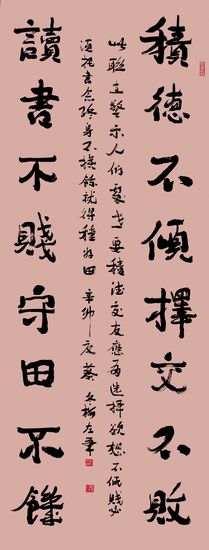 楹联,“积德不倾,择交不败”。此联看似平和安详,不激不励,但平中见奇,柔中有刚。作者在提按挑捺、轻重疾徐的法度中尽情放达。细细品味,有狮子搏象之情怀,深蕴老僧补衲之闲静,是左笔不可多得之力作。