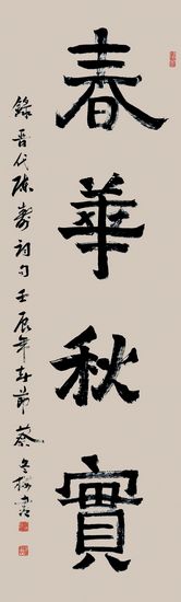 此幅作品用汉代“爨宝子”体笔划书写了“春华秋实”四个字。作品古拙厚重,方圆并用,活脱自然,气韵畅通,汉代隶书遗风若出其表。