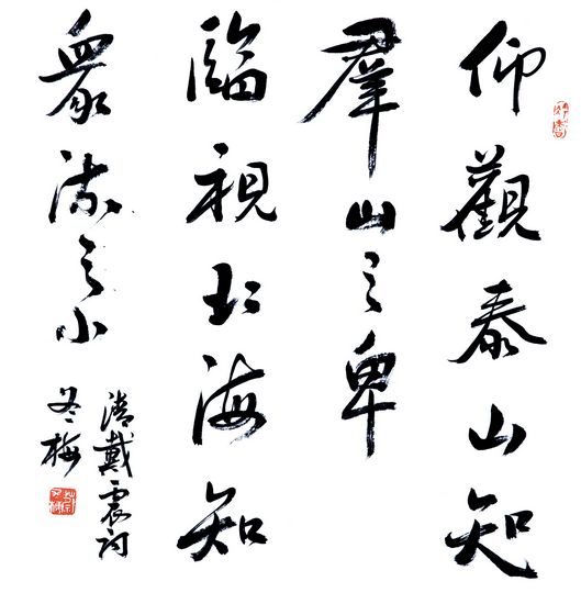 行书书写的“仰观泰山,知群山之卑”。作品不大,意境很高。布局章法得体,美观大方,读来耐人寻味。