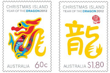 在龙年到来的时候,澳大利亚邮政局推出的龙年邮票描绘了传说中的龙及十二生肖的故事,用英文和中文印制在邮票的小型张上,而面值1.8澳元的生肖邮票的画面上显示的“龙”是活泼的繁体汉字,0.6澳元面值邮票是以剪纸图案的形式生动地展示龙的形象。