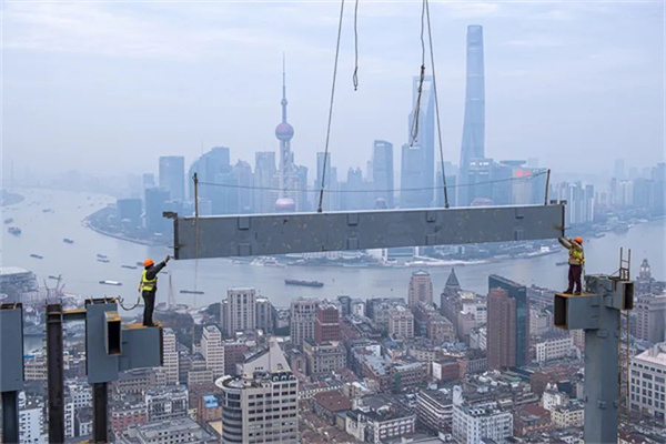 2020年12月23日,上海苏河湾中心大楼建设工地,两名工人站在高耸的钢柱上,协助钢梁就位。