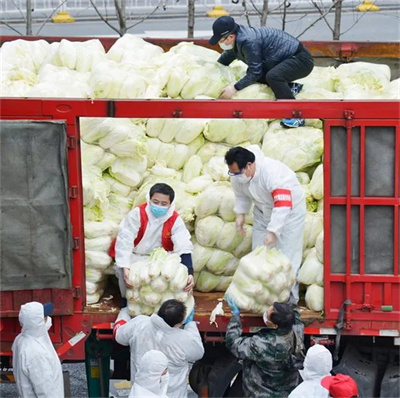 2020年3月12日,武汉徐家湾社区工作人员和下沉党员干部从货车上搬运来自湖北石首的爱心菜。