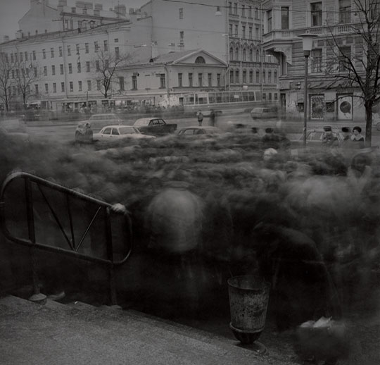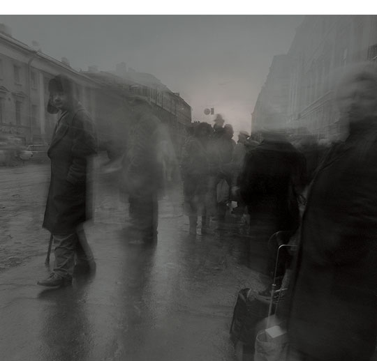 系列作品“影子之城”拍摄于1992-1994年,正是苏联刚刚解体之后。Titarenko在自传中称这一时期的俄罗斯“人们生活在无法实现的希望之中”,在创作中他大量运用了慢速快门技术,行走的人们变成了虚化的幽灵般的景象,城市则呈现出一片死寂。这些如鬼魅一般的阴影就是摄影师记录下的真实影像,也正是苏联给俄罗斯留下的东西。