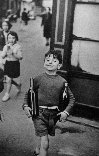 双手各抱着一只大酒瓶,踌躇满志的走在路上,看似得胜的将军。和背景中小姑娘的笑脸相映成趣。抓拍是布勒松一生所坚持的基本创作手段,他从来不去干涉他的拍摄对象。