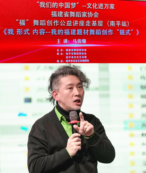 本次讲座特邀福建省舞蹈家协会青年创作委员会秘书长、福建师范大学音乐学院舞蹈系副教授马俊强授课。讲座以《“福”舞蹈创作形式和内容》为主题展开,结合2010年以来对福建“福”舞蹈《香扇春情》《百年情书》《文脉》《偶戏情牵》《海那边的爱》等,向学员传授了立足福建,弘扬福建精神的舞蹈挖掘和传承的创作理念;分享了对实际创作有帮助的经验和方法。