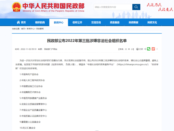 民政部11月2日公布2022年第三批涉嫌非法社会组织名单,包含中国舞蹈艺术家协会等10家。