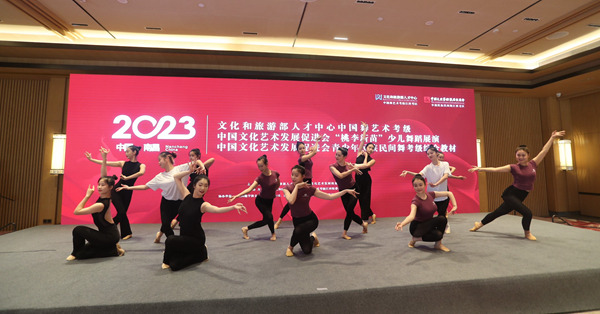 活动现场通过视频的方式展示了《青少年民族民间舞考级综合教材》第一至八单元的部分组合。通过组合展示,全面解析了《教材》在舞蹈训练学科建设中采集适合男女班分班设置的舞蹈教学法,以及青少年儿童年龄分段、元素训练、风格分类、普惠传承等设计完善的课程体系。从基础、兴趣到进阶、乐趣,再到提高、志趣,遵循少儿舞蹈教育规律。每个组合以中国较为具有代表性的民族民间舞为纲领,同时首次将独有性的民族歌舞融入教材之中,让青少年儿童通过民族民间舞元素的舞蹈短句、组合练习,加深对中华民族优秀传统文化和非遗舞蹈的认知和了解,真正实现中国民族民间舞的保护和传承从孩子们抓起。