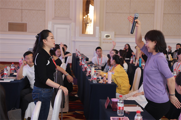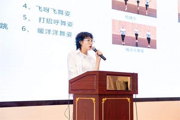康力元老师为学员们详细剖析“中国舞考级”第四版教材(4-6级)的各个组合,她声情并茂地授课,详细阐述每一个组合的教学目的与教育意义。她说:“我们要通过肢体的训练,让孩子们在身体力行中感受中国传统文化。”康老师边讲解边示范,学员们放松身心,全情投入,跟随老师一同做动作,学习兴趣高涨。康老师还寓教于乐,精心设置了游戏环节,通过“动作传声筒”和“你比划我猜”两个游戏有效检验了学员们的学习效果,一度将课堂氛围推向高潮。
